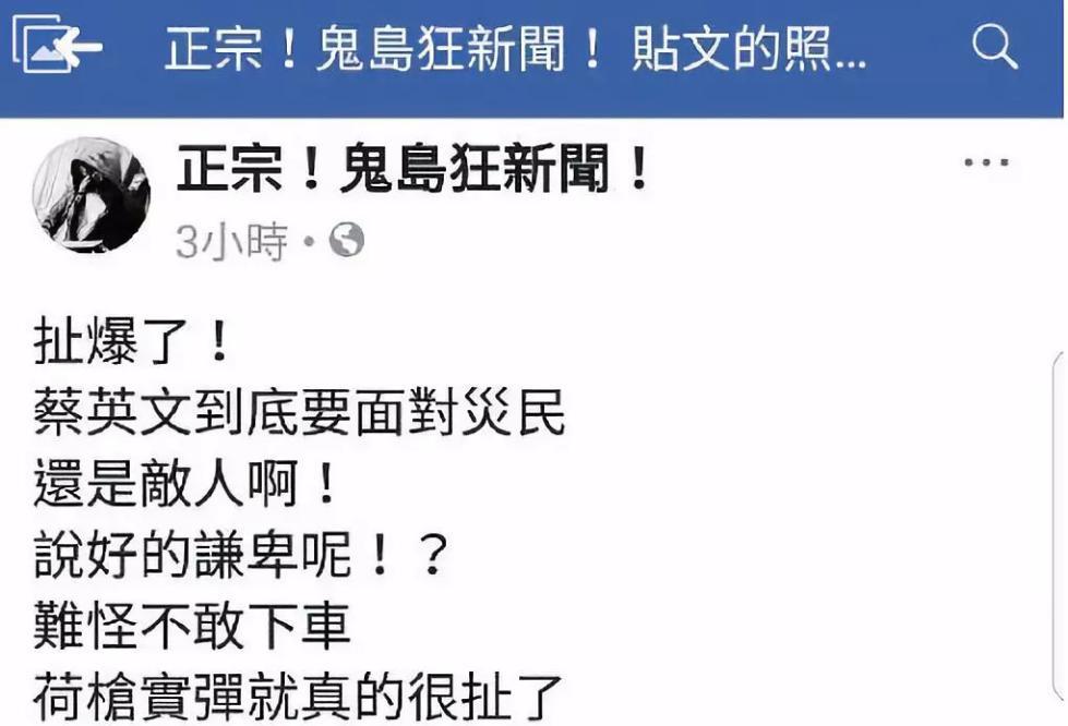 根据台媒的报道,这些说法出自台湾网友在脸书账号★★★“正宗★!鬼岛狂新闻!”上的贴文:“扯爆了!蔡英文到底要面对灾民还是敌人啊!说好的谦卑呢!?难怪不敢下车 荷枪实弹就真的很扯了”★★★。