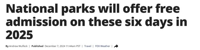 据FOX新闻12月8日报道 美国国家公园管理局最近宣布,将在2025年的几个特定日期免收全美所有国家公园的门票。