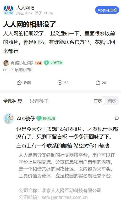 对于用户来说,人人网关闭,最大的遗憾是找不回过去的相册与内容,找不到青春的痕迹。